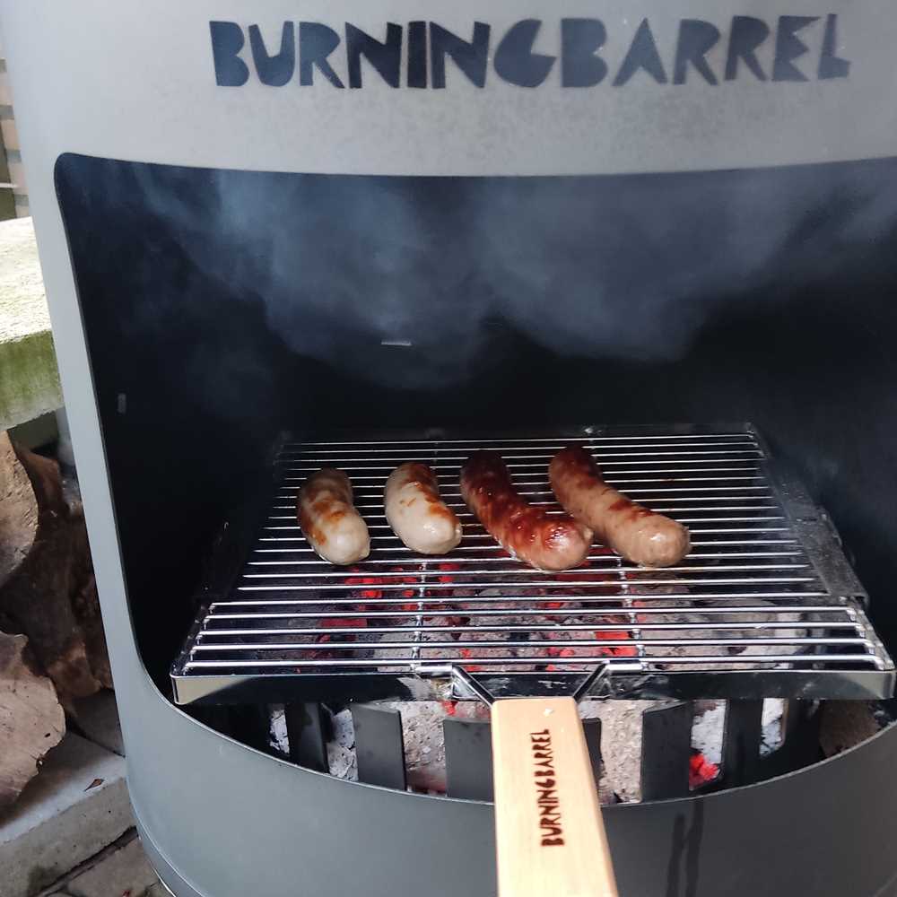Barbecue set bestaande uit een RVS grillrooster met houten opklapbare handgreep en twee schuifrails. Deze sliders worden tussen de tanden van de brandbak geschoven. Het rooster schuift hiertussen op en neer zodat je niet je handen verbrandt bij het omdraaien van de worstjes.